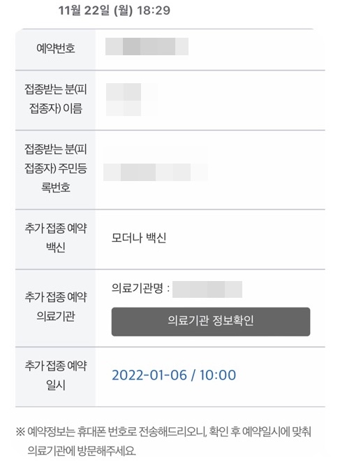 그리고, 어머니 3차접종 예약 전 날 안내문자가 예약날짜대로 제대로 왔다. 백신은 '모더나'라고 딱 정해져서 와 있었다. 그 다음날 11일은 토요일에 나는 근무를 해야해서 조심해서 접종 잘 하고 오라고 말씀드리고 출근을 했었다. 그렇게 일하다 보니 접종했다는 안내문자가 왔다.