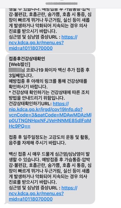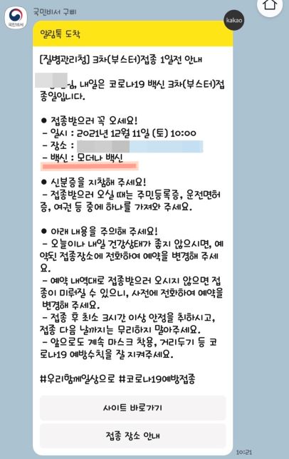 그리고, 어머니 3차접종 예약 전 날 안내문자가 예약날짜대로 제대로 왔다. 백신은 '모더나'라고 딱 정해져서 와 있었다. 그 다음날 11일은 토요일에 나는 근무를 해야해서 조심해서 접종 잘 하고 오라고 말씀드리고 출근을 했었다. 그렇게 일하다 보니 접종했다는 안내문자가 왔다.