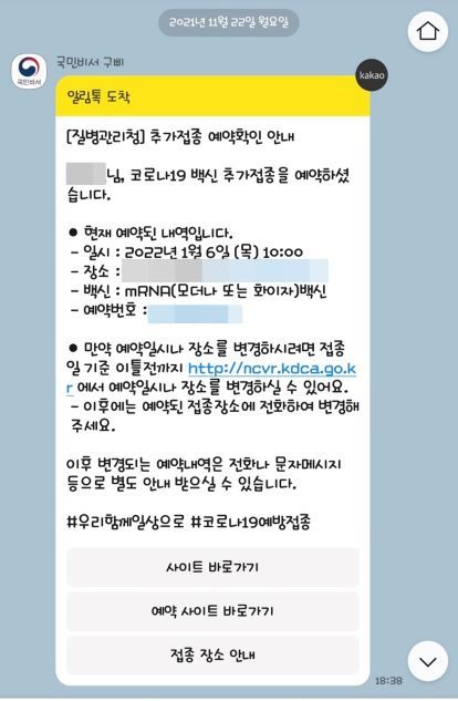 11월말쯤 문자를 받았습니다. 바로 부모님의 부스터 샷(3차 접종)에 대한 안내 문자였습니다. 안내문자에 따라 내년 1월달에 예약하기로 했습니다. 코로나 백신 1차 예약도 부모님 대신 제가 대리예약해서 3차접종도 해 드렸습니다.