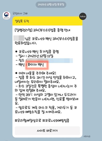 그런데, 접종 완료 문자를 보니 뭔가 이상했다. 다시 확인해 보니 백신이 '모더나' 백신이 아닌 '화이자' 백신으로 되어있었다. 또 안내 문자가 잘못 왔나 싶어서 아버지께 바로 전화를 했더니, 화이자로 접종했다고 하셨다. 그래서 어떻게 그렇게 그게 가능하냐고 여쭈어 보니, 어머니께서 문진하면서 의사선생님께 '화이자'백신으로 접종하면 안되냐고 문의를 했더니 '화이자'백신이 많다면서 '화이자' 백신으로 접종해 주었다고 한다. 그리고 그 병원에서는 부모님 뒤로 오시는 분들께도 '화이자'로 접종 할껀지 물어봤다고 한다.