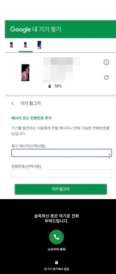 전화기는 꺼지지 않은 상태인데 아직까지 누군가 발견하지 못했다면 계속해서 전화를 걸어서 확인하면 배터리가 방전될 수도 있습니다. 그럴때는 잠금 설정을 해놓고 필요한 메시지를 표시해서 주운 사람이 전화를 할 수 있도록 하는 기능입니다.