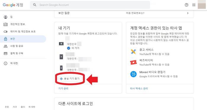 좌측에 보안 메뉴가 있는데 여기를 누르시면 아래쪽에 내 기기에서 '분실 기기 찾기' 클릭해줍니다.