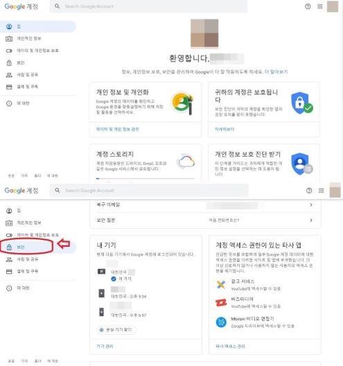 좌측에 보안 메뉴가 있는데 여기를 누르시면 아래쪽에 내 기기에서 '분실 기기 찾기' 클릭해줍니다.