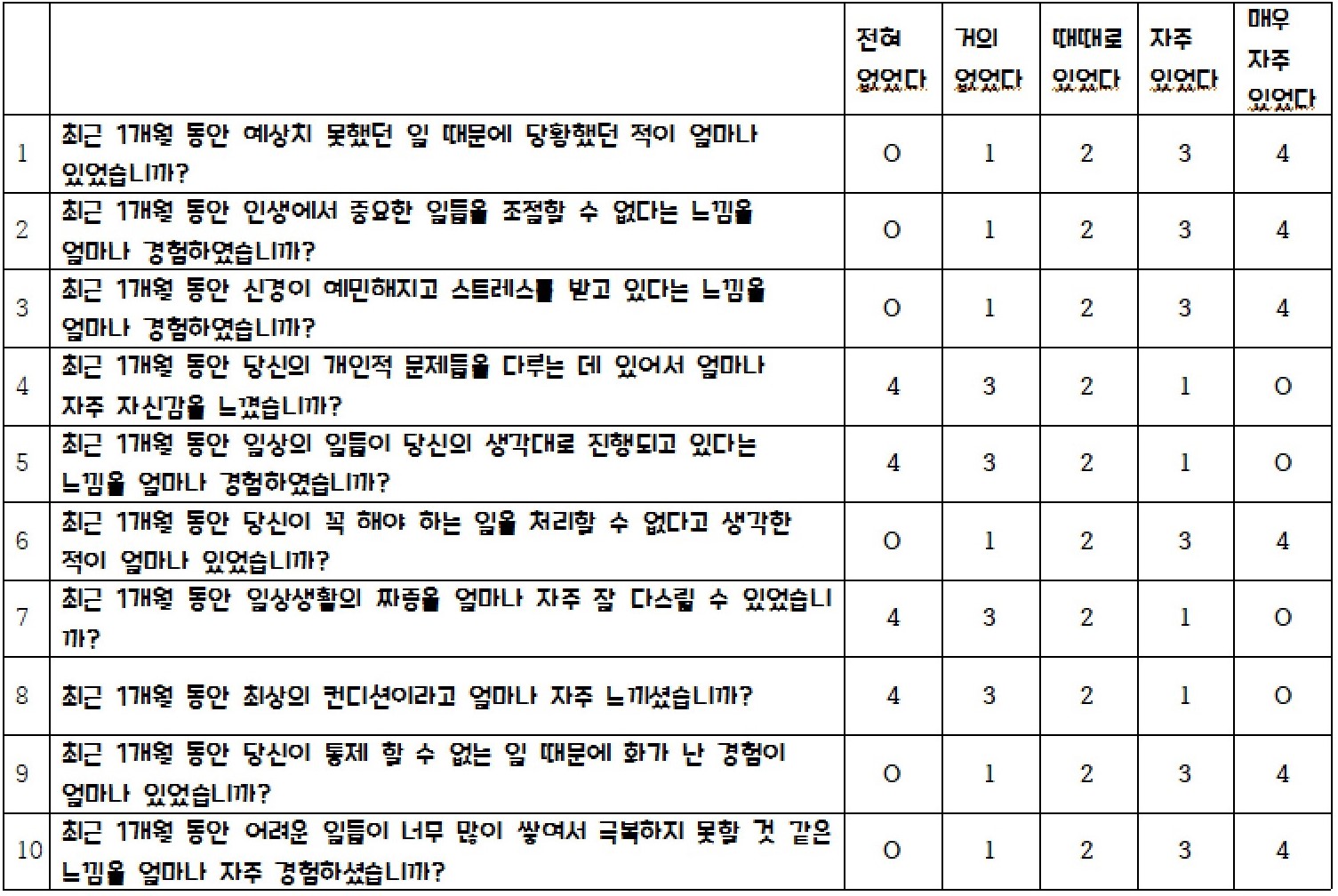* 출처 : 한창수 외(2012) 한글판 스트레스 자각 척도의 신뢰도와 타당도 연구. 정신신체 의학 20(2),127-134