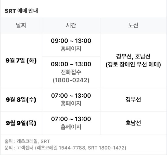 21년 추석 기차표 예매 KTX는 8/31~9/2로 3일간 끝났으며 SRT: 9.7~9.9 3일간 진행